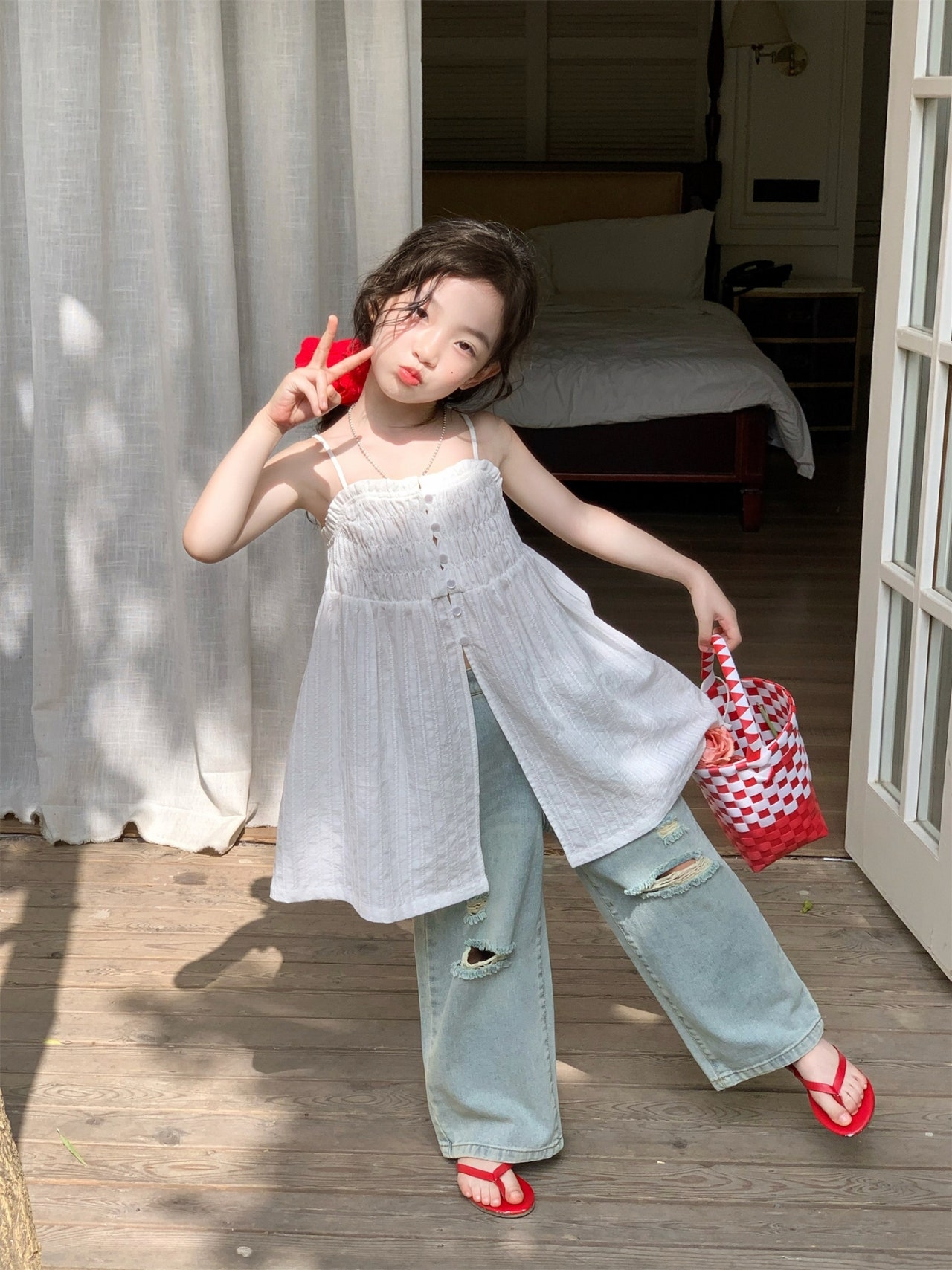 [수입]끈원피스+찢청와이드